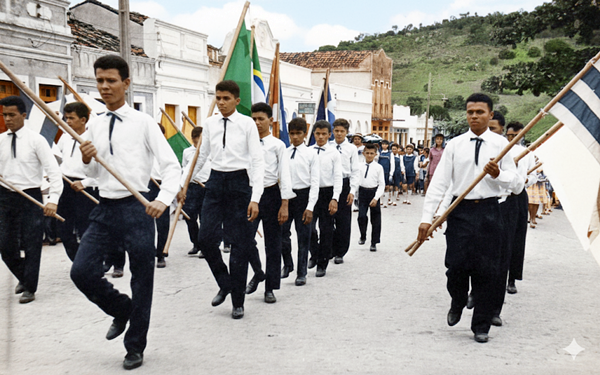 Pelotão dos bastões do Ginásio Nossa Senhora Auxiliadora (CNEC), durante desfile realizado em João Alfredo no dia 10 de outubro de 1965. Pelotão das bandeiras do Ginásio Nossa Senhora Auxiliadora (CNEC), durante desfile realizado em João Alfredo no dia 10 de outubro de 1965. Fotos: Hermes Portela/IA