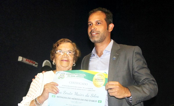 A professora e ex-vereadora Eva Souto Maior recebendo o certificado da outorga da Medalha do Mérito do Pau D’Arco, em Bom Jardim-PE, das mãos do vereador Sebastião Rufino Filho, no dia 10 de julho de 2015.