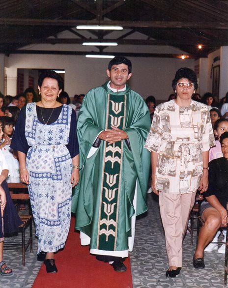 O padre João Ribeiro da Silva ladeado pelas professoras Vera Leal e Amélia do Rêgo Santos, antes de solenidade de posse nas gestões das escolas Nossa Senhora Auxiliadora (cidade) e Raul Soares (Tamanduá) em João Alfredo, realizada no ano de 1995.