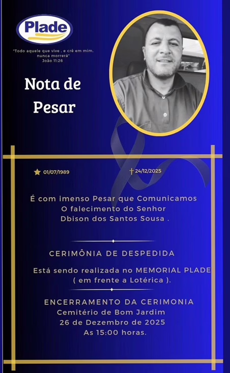 Faleceu quarta-feira (24) o Sr. DBISON DOS SANTOS SOUSA, aos 36 anos. O corpo está sendo velado no Memorial Plade, perto da casa lotérica, em João Alfredo. O sepultamento será realizado nesta sexta-feira (26) às 15h, no Cemitério do Bom Jardim.
