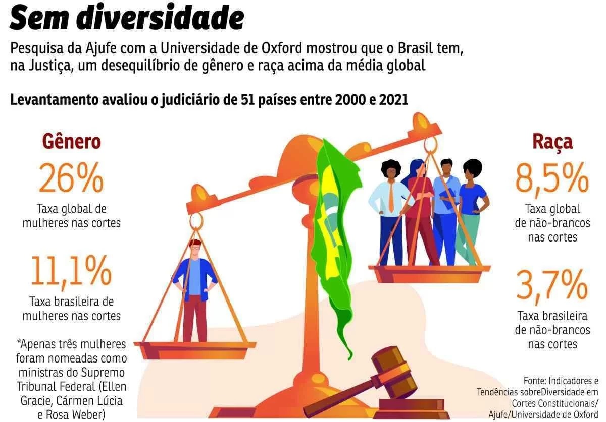 A pesquisa, que avaliou a diversidade do Judiciário no período de 21 anos, indicou que o país tem uma taxa de apenas 11,1% de mulheres — diante de 26% de taxa global de mulheres nas cortes (veja arte ao lado). Entre 27 candidatos a uma vaga de ministro do Supremo Tribunal Federal (STF) nesse período de mais de duas décadas, apenas três eram mulheres: Ellen Gracie, Cármen Lúcia e Rosa Weber.
