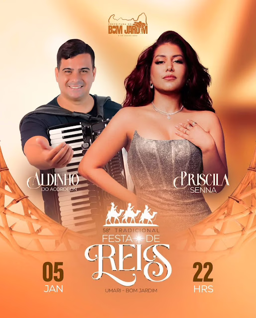 A Prefeitura do Bom Jardim confirmou as atrações musicais da 58ª Tradicional Festa de Reis, que será realizada no próximo dia 5 de janeiro, no distrito de Umari, a partir das 22h. O evento contará com apresentações da cantora Priscila Senna e do sanfoneiro Aldinho do Acordeon.