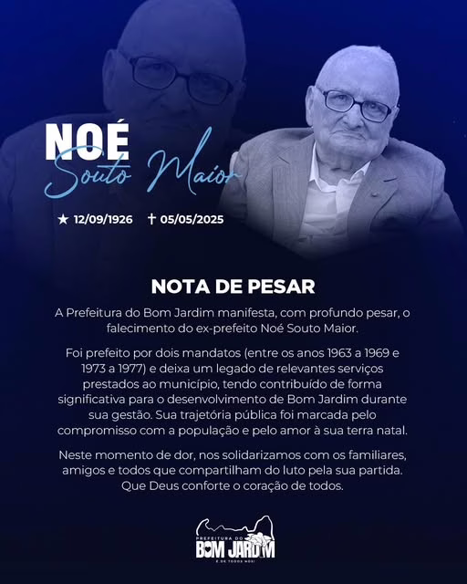 A Prefeitura do Bom Jardim manifesta, com profundo pesar, o falecimento do ex-prefeito Noé Souto Maior.